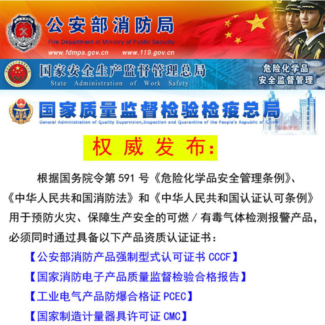 壁掛式可燃?xì)怏w報(bào)警器通過公安部消防產(chǎn)品型式認(rèn)可證書CCCF、國家消防電子產(chǎn)品質(zhì)量監(jiān)督檢驗(yàn)中心檢驗(yàn)報(bào)告、中華人名共和國制造計(jì)量器具許可證CMC、防爆合格證。